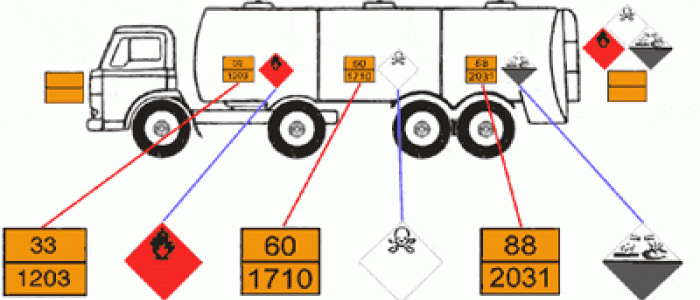 1° Positionnement général des étiquettes de danger et panneaux oranges